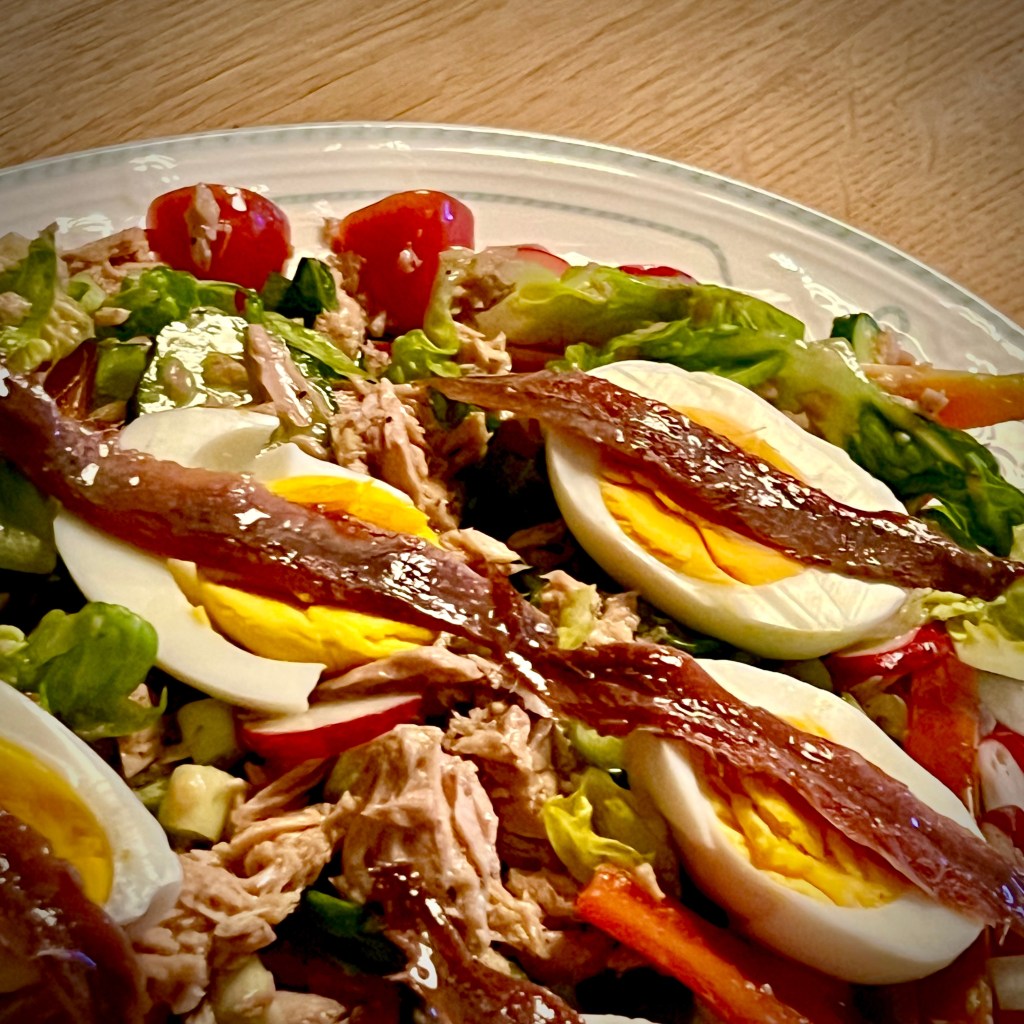 Komm, wir ziehen in den Frühling: mit einem Nizza-Salat! Eigentlich ein sehr einfaches Gericht, für das in Frankreich natürlich strenge Regeln gelten. Da ich kein Franzose bin, habe ich das Dressing (eigentlich nur Olivenöl und Zitronensaft) etwas opulenter gestaltet – mit Senf, Sushi-Essig, einem Spritzer Apfelessig und reichlich schwarzem Pfeffer. Ich wollte noch eine Prise Zucker einstreuen, aber ich hatte zuvor schon den Sushi-Essig mit Mirin verwechselt.