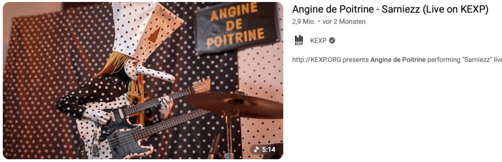 Mein erster Gedanke war: Ja, klar, diese Musik, dieser Auftritt, das Gesamtkunstwerk Angine de Poitrine passt ja genau in die Zeit! Alles verstörend. Vergesst die alten Schubladen, die Posen der Rocker, die Phrasen der Poeten, werft Buchstaben in die Suppe und löffelt frische Worte. In meinen Augen und Ohren kommentiert das Duo den Weltzustand, warum sonst nennen sie sich Angina Pectoris. Der Schmerz vor dem Infarkt ist ja spür- und sichtbar, auch im sonnigen Frühling, wenn uns Wale zum Sterben besuchen. Aber die Architektur des Untergangs wird anderswo gestaltet, unerreichbar für die Tentakel der Kunst. Guernica hat Gaza gezeigt, aber nicht gerettet. Hieronymus Bosch war der Hamas keine Warnung, sondern Ansporn. Und so weiter. Um den Kreis zu schließen: Mein zweiter Gedanke zu Angine de Poitrine war der gleiche wie der erste.